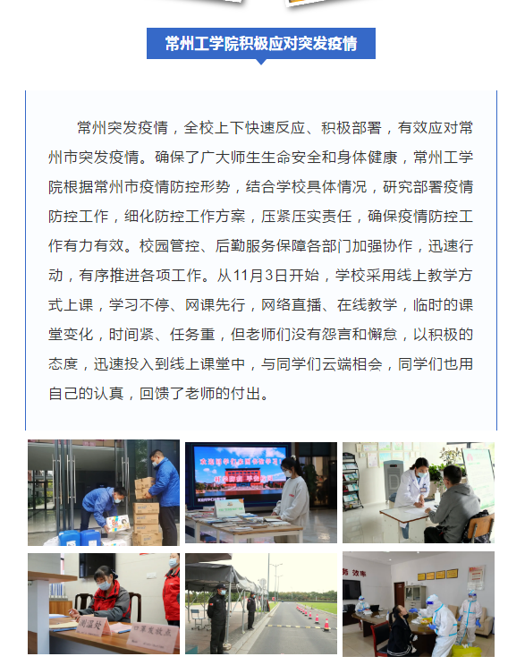 常州突发疫情,全校上下快速反应、积极部署,有效应对常州市突发疫情。确保了广大师生生命安全和身体健康,常州工学院根据常州市疫情防控形势,结合学校具体情况,研究部署疫情防控工作,细化防控工作方案,压紧压实责任,确保疫情防控工作有力有效。校园管控、后勤服务保障各部门加强协作,迅速行动,有序推进各项工作。从11月3日开始,学校采用线上教学方式上课,学习不停、网课先行,网络直播、在线教学,临时的课堂变化,时间紧、任务重,但老师们没有怨言和懈怠,以积极的态度,迅速投入到线上课堂中,与同学们云端相会,同学们也用自己的认真,回馈了老师的付出。