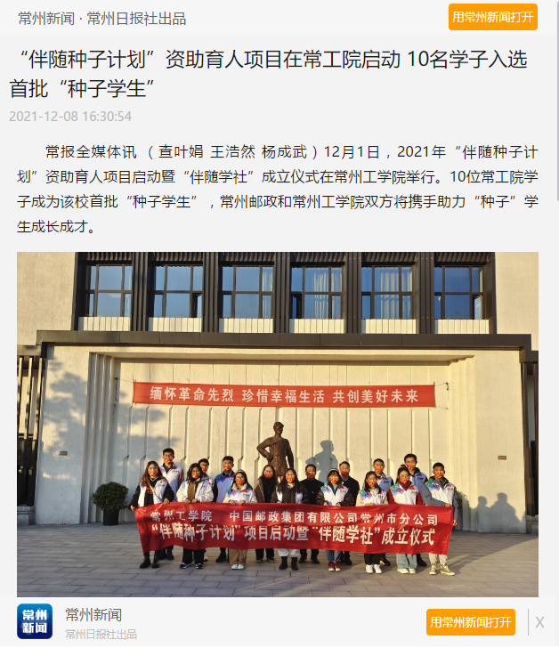 常报全媒体讯 (查叶娟 王浩然 杨成武)12月1日,2021年“伴随种子计划”资助育人项目启动暨“伴随学社”成立仪式在常州工学院举行。10位常工院学子成为该校首批“种子学生”,常州邮政和常州工学院双方将携手助力“种子”学生成长成才。
