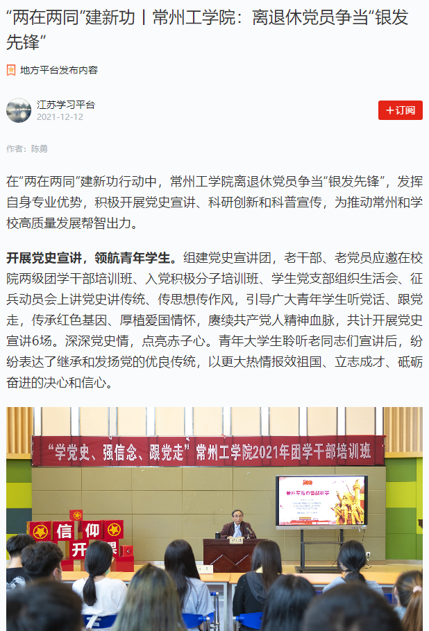 在“两在两同”建新功行动中,常州工学院离退休党员争当“银发先锋”,发挥自身专业优势,积极开展党史宣讲、科研创新和科普宣传,为推动常州和学校高质量发展帮智出力。