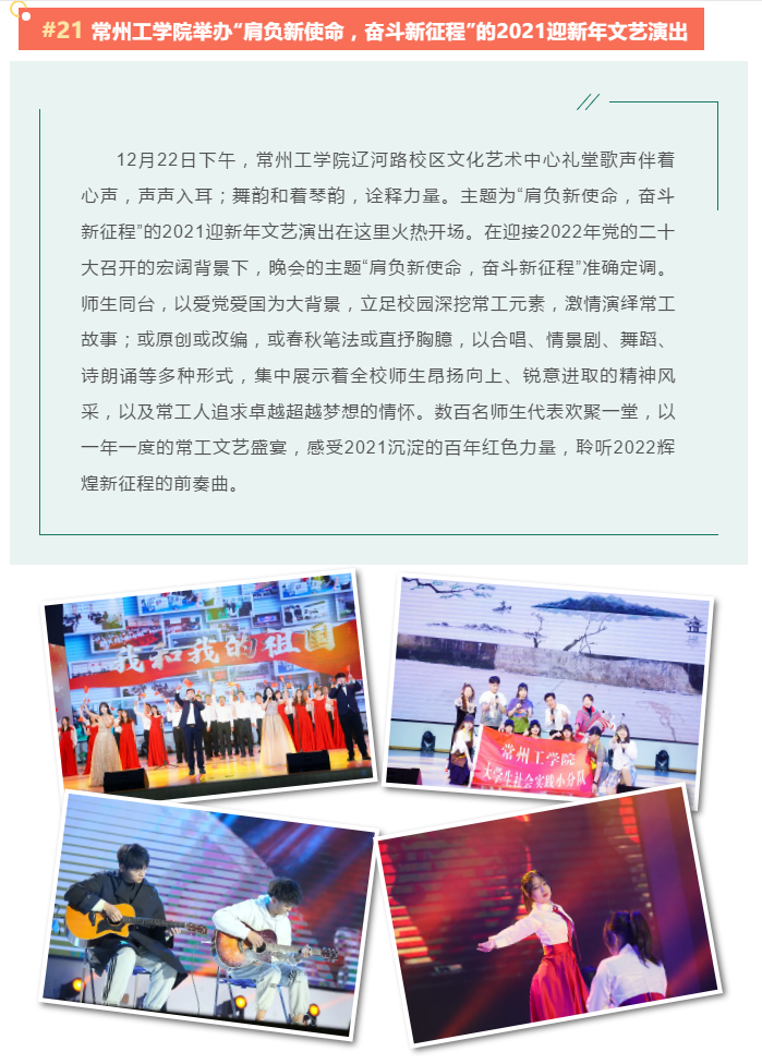 12月22日下午,常州工学院辽河路校区文化艺术中心礼堂歌声伴着心声,声声入耳;舞韵和着琴韵,诠释力量。主题为“肩负新使命,奋斗新征程”的2021迎新年文艺演出在这里火热开场。在迎接2022年党的二十大召开的宏阔背景下,晚会的主题“肩负新使命,奋斗新征程”准确定调。师生同台,以爱党爱国为大背景,立足校园深挖常工元素,激情演绎常工故事;或原创或改编,或春秋笔法或直抒胸臆,以合唱、情景剧、舞蹈、诗朗诵等多种形式,集中展示着全校师生昂扬向上、锐意进取的精神风采,以及常工人追求卓越超越梦想的情怀。数百名师生代表欢聚一堂,以一年一度的常工文艺盛宴,感受2021沉淀的百年红色力量,聆听2022辉煌新征程的前奏曲。