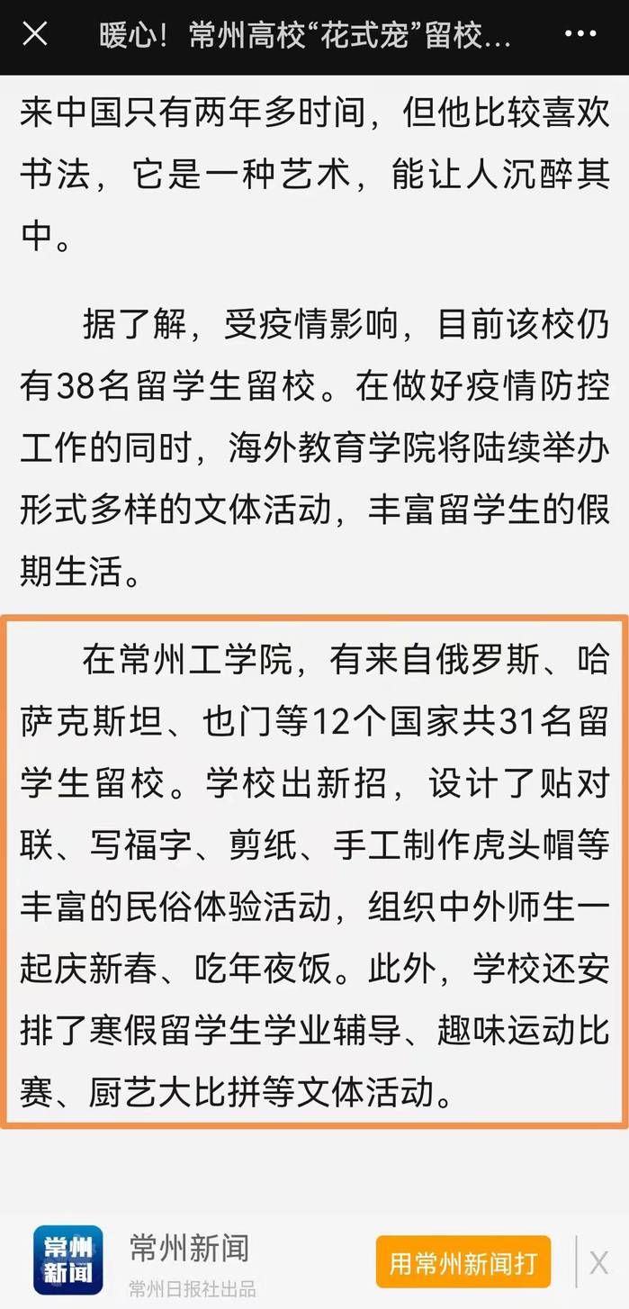 在常州工学院,有来自俄罗斯、哈萨克斯坦、也门等12个国家共31名留学生留校。学校出新招,设计了贴对联、写福字、剪纸、手工制作虎头帽等丰富的民俗体验活动,组织中外师生一起庆新春、吃年夜饭。此外,学校还安排了寒假留学生学业辅导、趣味运动比赛、厨艺大比拼等文体活动。