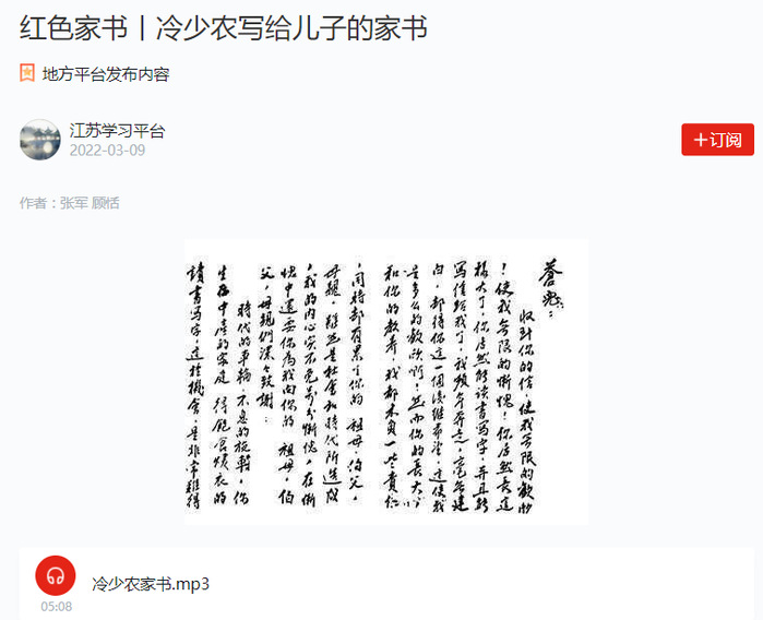 在这封不足800字的信中,我们能感受到冷少农对儿子深切期许与厚望。这不仅是一封普通意义上的家书,比如教育子女要好好学习、孝敬长辈、诚实守信等,它还是一个革命父亲的感召与呼唤,要求子女不能“一切以自己以家庭利益为重”,更要有远大的理想抱负,立志成为一个“极平凡而有能力为一般劳苦民众解决不能解决之各项问题、铲除社会上一切不平等之人物”。