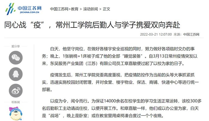 白天,他坚守岗位,在做好各楼宇安全巡视的同时,努力做好各项临时交办的事务;晚上,1张躺椅+1床被子成了他的全部“睡觉装备”。自3月13日常州疫情突发以来,东吴服务产业集团(江苏)有限公司员工章嘉敏便过起了以校为家的日子。