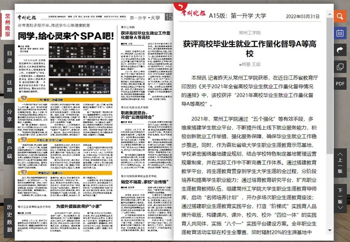 本报讯 记者昨天从常州工学院获悉,在近日江苏省教育厅印发的《关于2021年全省高校毕业生就业工作量化督导情况的通报》中,该校获评“2021年高校毕业生就业工作量化督导A等高校”。