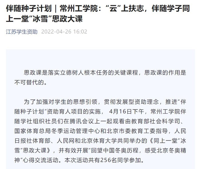 为了加强对学生的思想引领,贯彻发展型资助理念,推进“伴随种子计划”资助育人项目的实施, 4月16日下午,常州工学院伴随学社组织社员们在腾讯会议上一起观看由教育部社会科学司、国家体育总局冬季运动管理中心和北京市委教育工委指导,人民日报社体育部、人民网和北京体育大学共同举办的《同上一堂“冰雪”思政大课》,并有效开展“回望中国冬奥历程,感受北京冬奥精神”心得交流活动。本次活动共有256名同学参加。