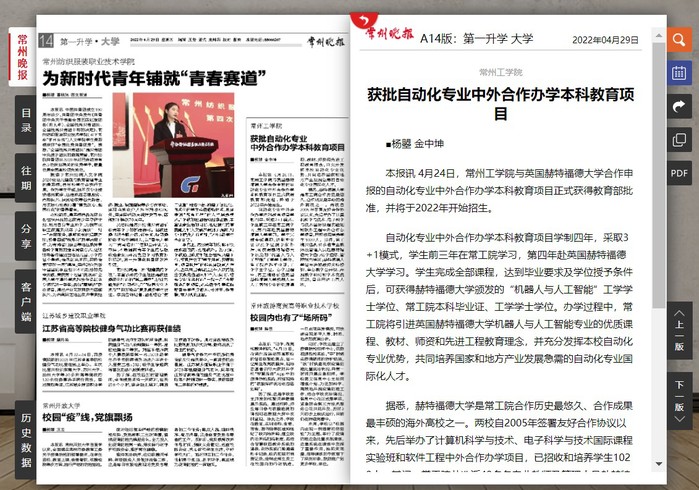 本报讯 4月24日,常州工学院与英国赫特福德大学合作申报的自动化专业中外合作办学本科教育项目正式获得教育部批准,并将于2022年开始招生。