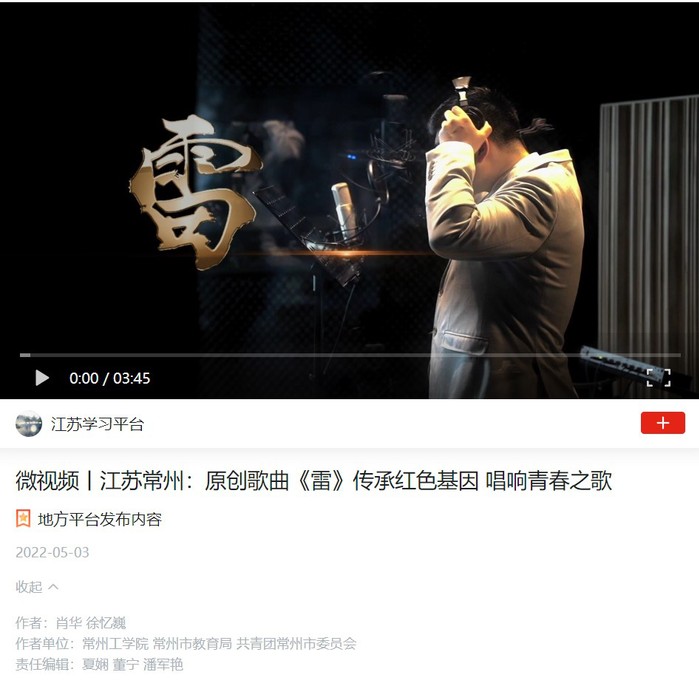 正值中国共产主义青年团成立100周年之际,常州工学院、常州市教育局、共青团常州市委员会联合推出原创歌曲《雷》。本作品精选张太雷的经典语录为词,由常州工学院师范学院青年教师徐忆巍博士作曲,师范学院师生共同演唱,用青春好声音,传承红色基因,永远跟党走。