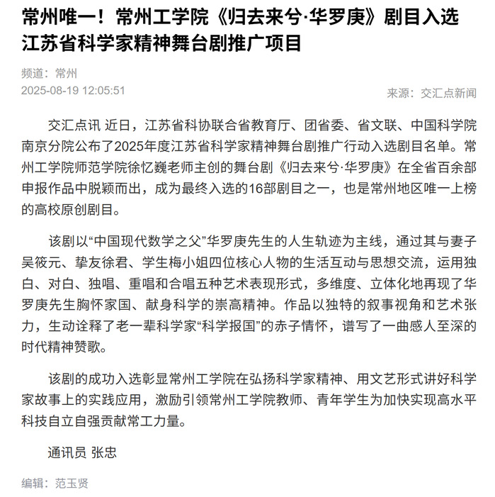 交汇点讯 近日,江苏省科协联合省教育厅、团省委、省文联、中国科学院南京分院公布了2025年度江苏省科学家精神舞台剧推广行动入选剧目名单。常州工学院师范学院徐忆巍老师主创的舞台剧《归去来兮·华罗庚》在全省百余部申报作品中脱颖而出,成为最终入选的16部剧目之一,也是常州地区唯一上榜的高校原创剧目。