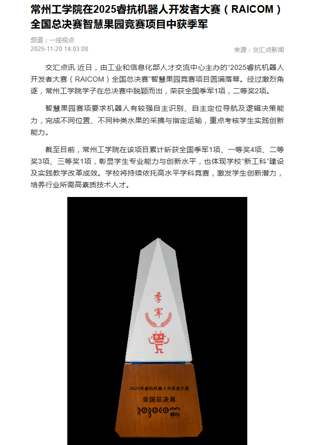 交汇点讯 近日,由工业和信息化部人才交流中心主办的“2025睿抗机器人开发者大赛(RAICOM)全国总决赛”智慧果园竞赛项目圆满落幕。经过激烈角逐,常州工学院学子在总决赛中脱颖而出,荣获全国季军1项,二等奖2项。