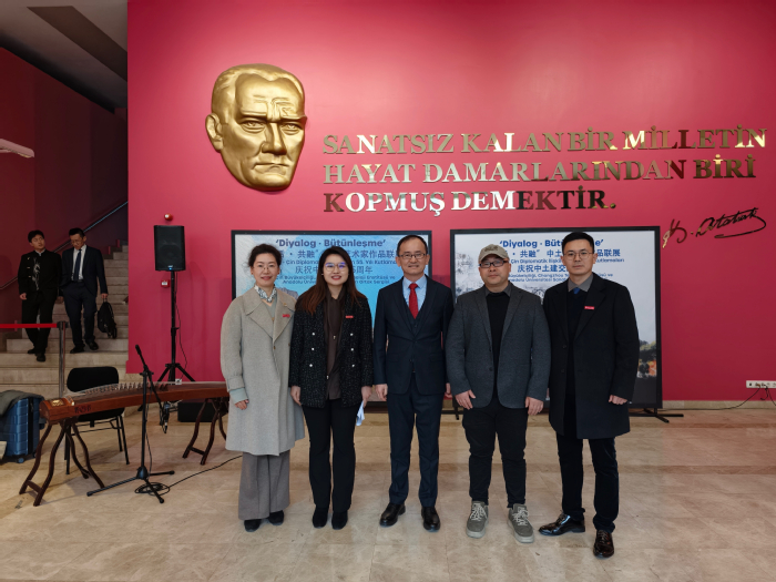 在中国驻土耳其大使馆、埃斯基谢希尔市政府、安纳多卢大学联合举办的中土建交55周年系列庆祝活动——“对话 共融”中土艺术家作品联展开幕式上,干方群致辞。她希望以此为契机,未来在师生互访、学术研究、联合创作等方面结出更多硕果,让青春的创造力成为中土两国关系历久弥新的活力源泉。干方群还向埃斯基谢希尔市市长Ayşe Ünlüce赠送象征着幸福与吉祥的“福”字。中国驻土耳其大使姜学斌为中土建交55周年标志设计者刘毅飞老师颁发证书。安纳多卢大学校长Yusuf Adigüzel为我校参展艺术家颁发证书。来宾们驻足欣赏精美的书画作品,观看传统歌舞表演,赞叹中土文化魅力,祝福中土友好,现场气氛热烈。