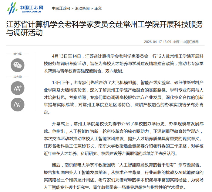 4月13日至14日,江苏省计算机学会老科学家委员会一行12人赴常州工学院开展科技服务与调研考察活动,旨在为高校人才培养与学科建设精准建言献策,推动老专家学术智慧与青年教育实践深度融合、双向赋能。