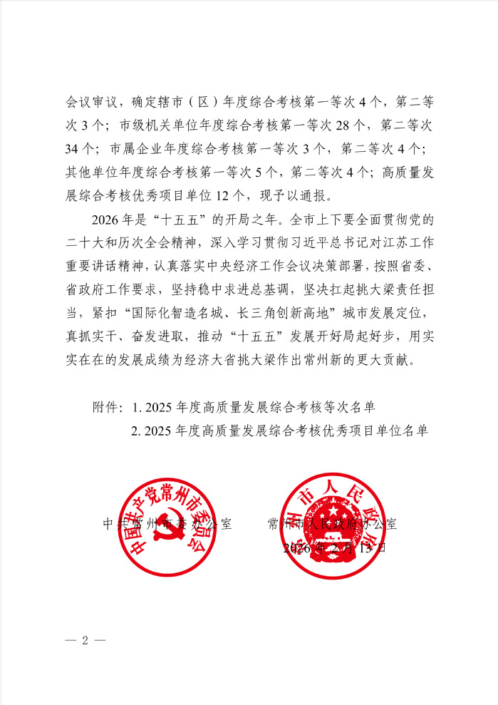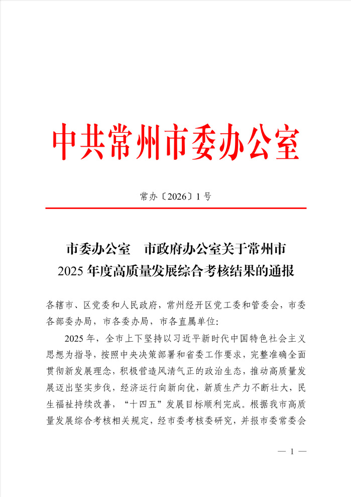 近日,常州市委办公室、市政府办公室公布常州市2025年度高质量发展综合考核结果。我校获得“第一等次”。这也是学校连续第四年获此殊荣。